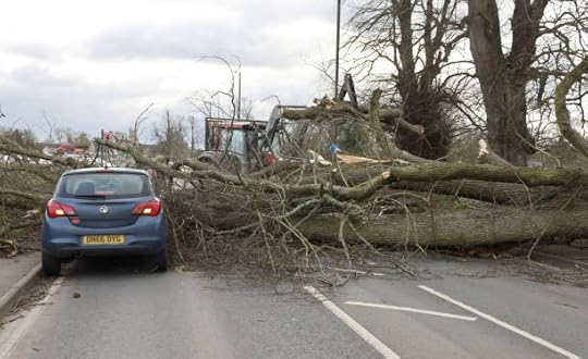 Image: A tree, fallen on the road, just in front of a small car (Source)