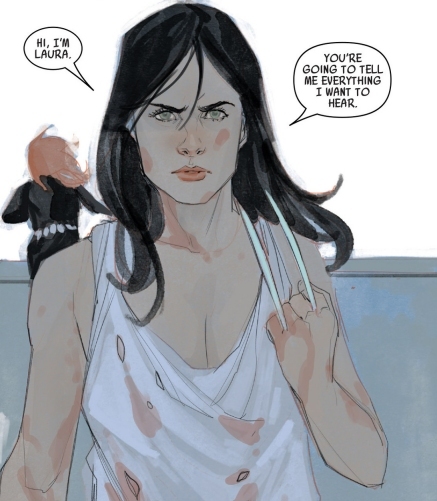 Side-note: Laura's appearance reminds me of Jessica Drew and now I want a Black Widow/Spider-Woman team-up. That would be amusing.