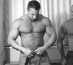 ‘...shirtless, showing off well-maintained “bear”-style physiques— ripped muscles and hairy chests, and faces with stubble. One man is younger, with short dark-brown hair, and the other man is older, with slightly graying hair and stubble. ...’