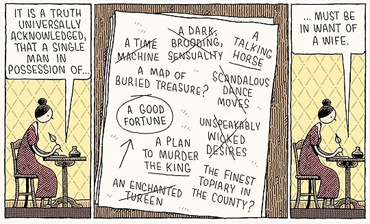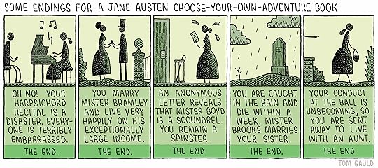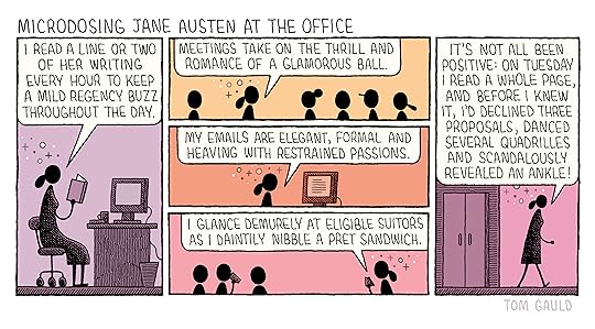 (These cartoons by Tom Gauld (not in the book but published in The Guardian) made me laugh and reminded me of Jennie Batchelor’s introductory observations that "Perhaps all our Austens are different" and that “"We all encounter Austen differently and from the position of where and when we read her. How we read her changes as the world changes around us. And it is perhaps above all this relentless change that keeps us going back to Jane Austen. She knew that every life was a series of events – some planned, many not. She knew that life was messy and that human relationships bear the weight of the world. Who better then, to help us navigate that life than Britain’s best loved novelist?")