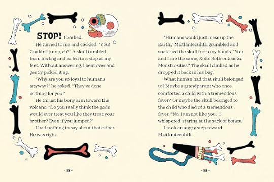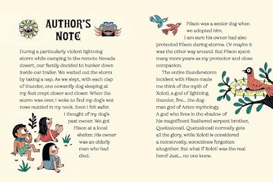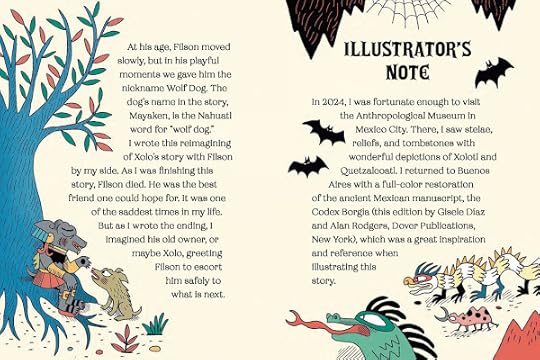 The illustrator snuck in a little reference to axolotls, which were named for Xolotl. That's fun. Another Xolo book out this year would be a good companion read: Popo the Xolo. It's about a Xolo dog guiding a grandma through death.