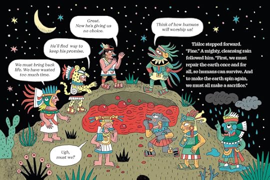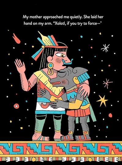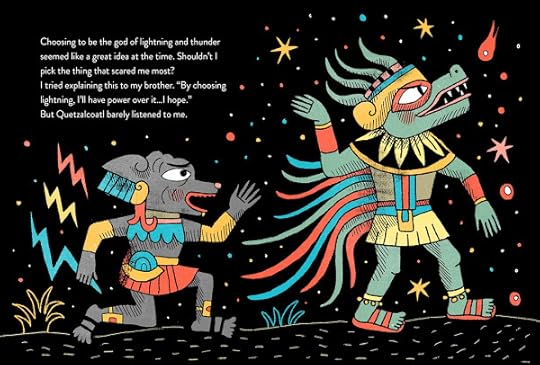 5 stars for the art, it's fantastic. And 3 stars for the text because it read a little clunky to me. Xolo is kind of a sad sack and the story is mostly told from his POV. I would've preferred if an omniscient narrator had told the whole story. Still, I think this would make a good read-aloud for parent and child (if the grown-up can handle pronouncing the names of the Aztec gods; there's no pronunciation guide).