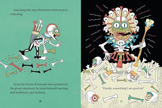 8yr old: I don’t like the God of the Underworld Mictlantecuhtil because he stole all the dead human bones and made them into silly stuff like a crown and clothes. At the end of the book I like that Xolo and Quetzalcoatl took the bones of humanity back. The names are hard to say but it’s fun trying to say it correctly. I like the pictures and all the colors on every page especially this page (swipe for 2nd picture).