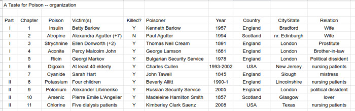Within the annals of crime, murder holds a particularly heinous position. And among the means of killing, fewer methods generate such a peculiar morbid fascination as poison. Compared with hot blooded spur of the moment, murderers, the planned and cold calculations involved in murder by poison, perfectly fit the legal term malice aforethought. Poisoning requires planning and knowledge of the victim’s habits. It requires consideration of how the poison will be administered. Some poisons can kill within minutes; others can be given slowly, over time, gradually accumulating in the body, but still leading inexorably to the victim’s death.If you are a fan of True Crime, if you are a fan of TV procedurals, if you are a fan of murder mysteries, A Taste for Poison is a must read. You will be much better prepared to keep up with the medical examiners in all venues when you can recognize the victims’ symptoms, at least if the book or show gives you a chance to try figuring it out for yourself before the truth is revealed.
