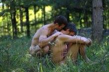 Photo Description: A naked man sitting with his knees pulled to his chest and his head hanging down. He is in the middle of an overgrown field, surrounded by woods. Another naked man is crouched at his back, holding his shoulders, and he has his face buried in the back of the seated man’s neck.