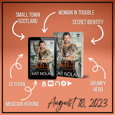 Protector in a Kilt by Kait Nolan, book four in her Kilted Hearts series, is former special forces operative Ewan McBride and talented violinist Elizabeth (aka Isobel) Duncan’s story, the woman who claimed his heart. Elizabeth only has her music, as she is under tight control of the manager/agent her mother signed with when Elizabeth was twelve years old. When his strict authority threatens her physical well-being, Elizabeth runs away. Her running finds her on a deserted road in a thunderstorm, and having a tree crash onto the car she was driving; Ewan McBride discovers her and takes her to his home in a small village near Inverness. He tends to her wounds, and realizing she's running from something, vows to keep her safe. Ewan has felt adrift, haunted by his past and searching for purpose. Encountering Isobel brings out his caring heart and protective side, as Ewan knows he will risk everything to protect her and keep her safe.