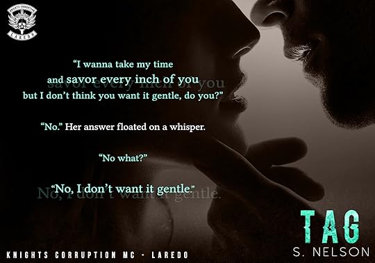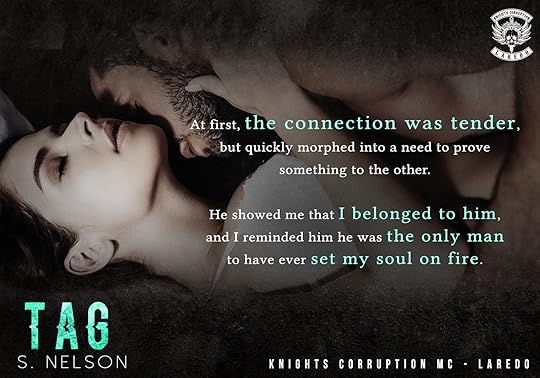 TAG by S. Nelson Knights Corruption MC - Laredo Book #1 Tag and Morgan's story Thrilled to be back in the Knights Corruption world again!! Tag has definitely been a favourite of mine and I think Morgan is perfect for him. They have a strong, steamy relationship. His need to keep her safe is endearing and their chemistry is HOT! He had endured so much in the past and yet stayed with the club. He's super possessive of Morgan so he decides to accompany her to Laredo for a few months while she sets up a new art studio for her boss. Needless to say, things escalate and danger is real. This book keeps you guessing and I loved the suspense. I enjoyed getting some time with MC boss Marek again along with all the guys from the club. The new characters are intriguing and I look forward to learning more about them in the upcoming releases. Things certainly escalate near the finish and I am dying to know where this is all going to lead them!!
