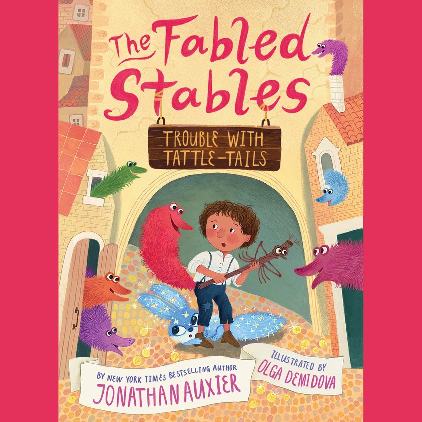 Trouble with Tattle-Tails: ["Auggie and his magical companions are tending to the Fabled Stables when the building shakes and shudders to make room for a new arrival: the Tattle-Tail. Auggie and friends travel through the portal to a town called Rainbow’s End in search of this mysterious creature. Auggie assumes that the Tattle-Tail is in danger, but he learns that it’s actually the town that needs rescuing . . . from an infestation of Tattle-Tails! // These talking tails have taken over, attaching themselves to every backside in town (including Auggie’s!). The Tails tattle on whomever they’re attached to: She picked her nose! He just double-dipped! The constant stress of being tattled on has thrown all of Rainbow’s End into chaos! // Soon, Auggie and friends hatch a plan to collect the Tattle-Tails and bring them safely to the Stables—foiling a pair of evil bank robbers along the way."]