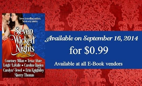 There are a lot of boxed sets available now on Amazon and iBooks. Romances, mysteries , paranormals and gothics galore between the $2.99-99 cent price point. In the past, I have bought a few of these book bundles and liked one or two of the stories. I hit the jackpot with Seven Wicked Nights. Seven Wicked Nights contains seven stories from authors Courtney Milan, Caroline Linden, Tessa Dare, Carolyn Jewel, Sherry Thomas, Leigh LaValle and Erin Knightley. Each contribution varies in length from four chapters to 13 chapters. Each story is unique and complete. With a total of 170,000 words the book is comparable to two-full length novels well -worth the 99 cent investment