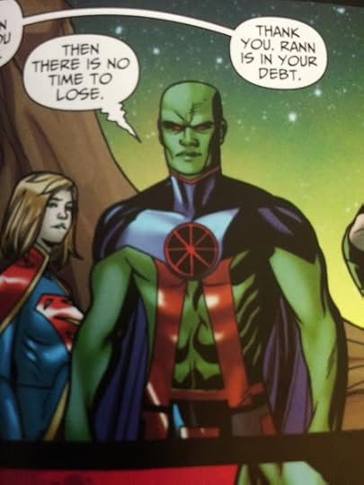 The art, by Mike McKone, is pretty standard fare for comics art these days, which is to say inconsistent. Sometimes it's very nice, and sometimes it's very rushed looking. I wouldn't buy this book for the art, but I would necessarily NOT buy it for the art either. But back to Martian Manhunter... what the heck is up with his appearance?! Early in the book he had the smooth-head appearance, and later in the book we had a very angled, rough, almost lizard-like appearance. I thought maybe one of the aliens they were encountering was doing something to him, but no one in the issue made comment on it and I realized it was just the artists decision to change his appearance. I was maddened by this! I understand that he has different 'looks' depending on the comic or cartoon episode that you might see, but to change it mid-stream? Really? Is this the quality of book we're looking at, that there is no consistency?