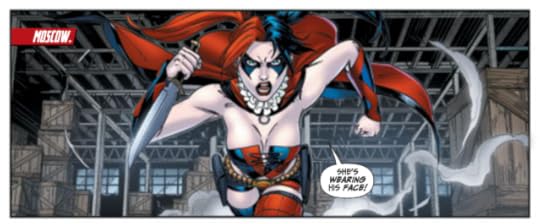 The story is sporadic and hectic, with no real purpose. The first three issues were, as I mentioned earlier, mainly about the cat-fight between Harley and Joker's daughter. The rest of the story--their entire reason for being in Russia in the first place--is often pushed to the side to make room for those two characters. Beyond the fourth issue, once they wrote Joker's Daughter out of the story, things start to make sense, but it's still a rushed and poorly written mess. For the most part it's just regular espionage stuff, going to other countries and accidentally fucking things up and accidentally saving America from communist superheroes. Nothing really special about it.