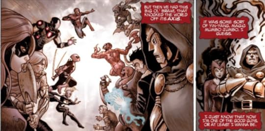 The basic gist of the suck-y Marvel Axis crossover event was ex-Nazi The Red Skull ate Professor Xavier’s brain, with a side of schnitzel and washed it down with a hefty mug of Pilsner, gaining Charles Xavier’s immense power as a result. There’s a showdown (yawn) between the forces of good and evil and the natures of the combatants are reversed because of some crazy voodoo sh*t done by Dr. Strange and that creepy, trouble-making vixen, The Scarlet Witch.