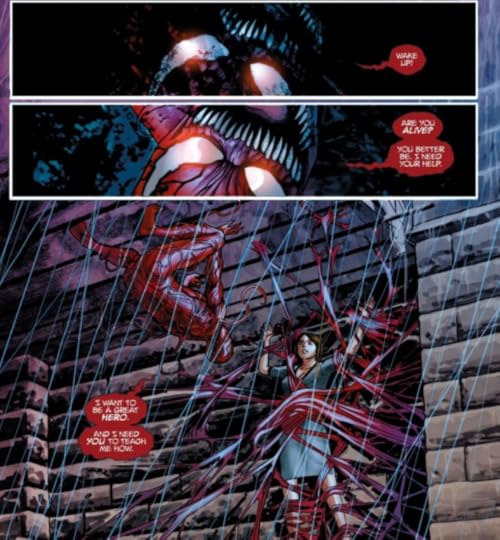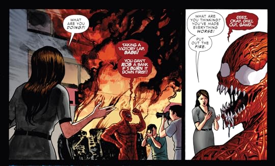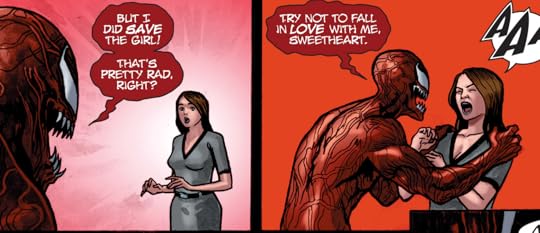 Carnage is.... a crazy person. So even a Carnage that is trying to be good - is bad. The story is about him wanting this lady... who is no saint either... to teach him how to be good, meanwhile she manipulates him into doing her bad stuff. I mean this is a pretty negative book and the attempt at comedy kind of fell flat for me most times.