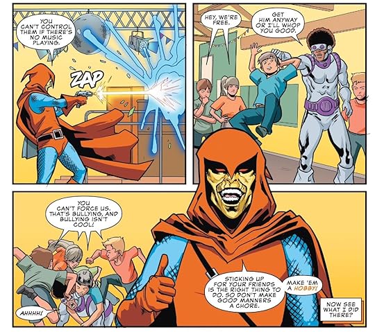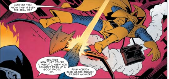 Here, I think the thing that sold me is the Hobgoblin half of the book. The Carnage half was mildly amusing but there wasn't much there beyond the premise. The Hobgoblin half was pretty cute in that the contrast between the visual and the story was so strong and that the Hobgoblin functioned almost exactly the same good as evil. It was wildly implausible how quick he was able to make the shift as a large organization. But I guess that was necessary for the story.