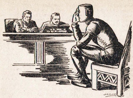 "Well, I'll tell you." Donovan rolled onto his stomach, and took a firm grip on his wild, red hair to hold his head up. "There's a certain principle involved. After all, as a trouble shooter, I've played a part in the development of new robots. There's the principle of aiding scientific advance. But don't get me wrong. It's not the principle that keeps me going; it's the money they pay us. Greg!'
