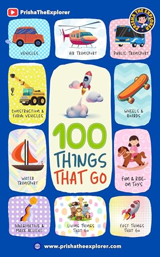 100 Things That Go includes various vehicles, such as cars, buses, trucks, trains, bicycles, scooters, motorcycles, vans, tractors, ambulances, police cars, fire trucks, taxis, RVs, pickup trucks, delivery vans, limousines, electric cars, golf carts, race cars, and more.