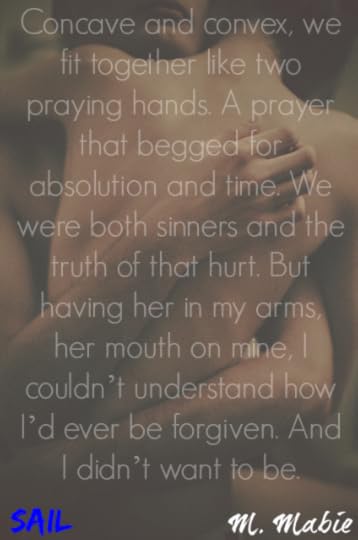 Words fail me when I try to put into words how deeply affected I was by this book. I ran the full range of emotions while reading Sail. It’s simply perfect, in every way. I wouldn’t and couldn’t change a single word. Mabie took a story and characters that I absolutely adored and cranked it up by 1000. Mabie’s work is something that will move you deeply, her words, her voice is beautiful. Taking two characters that were so incredibly flawed and had made such unbelievably bad decisions come full circle was an absolute pleasure to experience. Sail is romance, its passion, its heartbreak, its perseverance, its learning and moving on from your mistakes, and your past, it’s facing the truth and discovering that love can ultimately overcome even the most incredible odds.