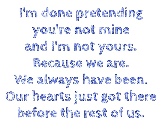 “I lie about how much you mean to me or how bad I miss you. I’m done pretending you’re not mine and I’m not yours. Because we are. We always have been. Our hearts just got there before the rest of us.”