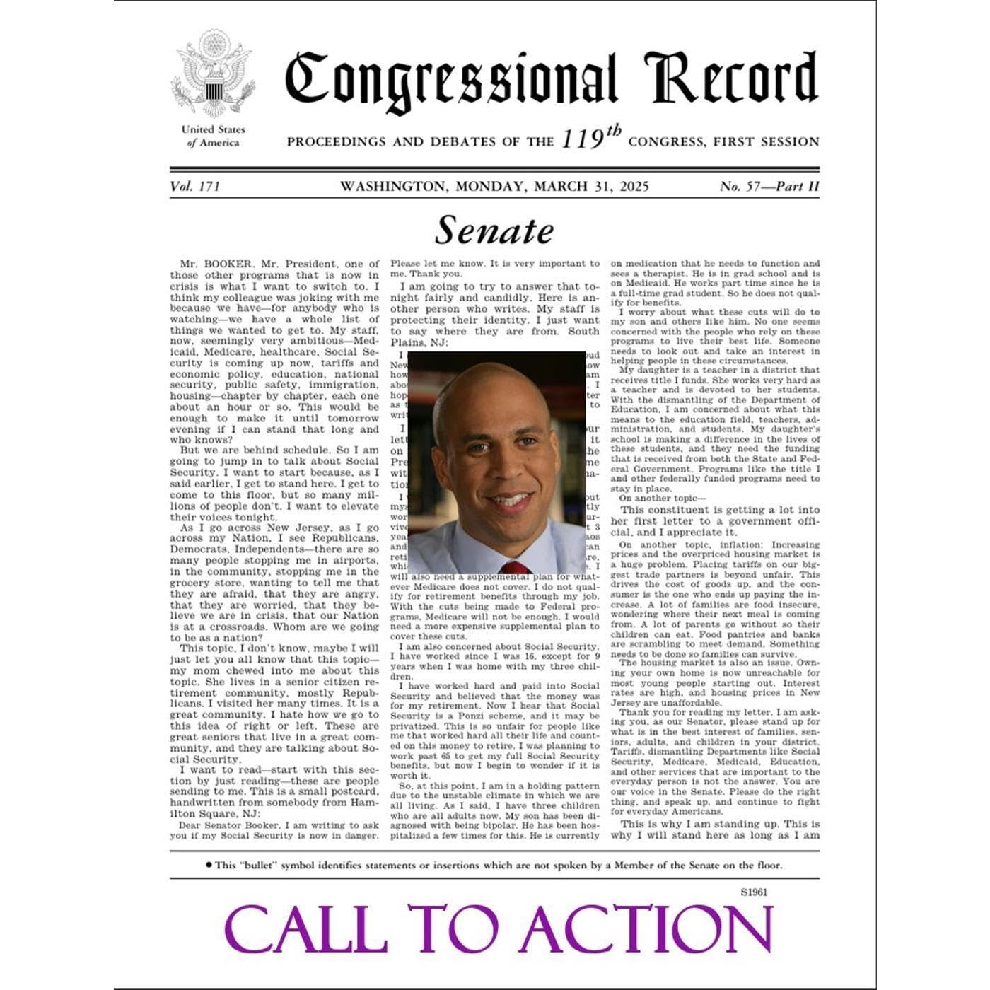 "Cory Booker breaks a 68-year-old Senate record with a 25-hour speech Updated April 2, 20257:17 AM ET By Rachel Treisman, Alana Wise... Booker wiped away tears and placed his hand over his heart as fellow Democrats cheered at the end of his 25-hour, 4-minute speech. Others were seen crying and some rushed to hug the visibly exhausted and emotional Booker.... Booker's speech took aim at President Trump, White House senior adviser Elon Musk and policies that he said show a 'complete disregard for the rule of law, the Constitution and the needs of the American people.'..." ~NPR