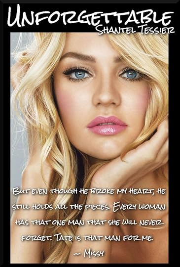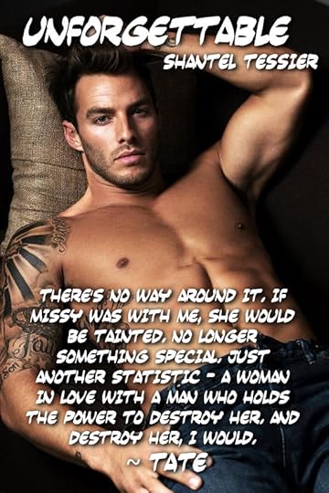 Move over Slade (Book 1, Undescribable), there is a new “hunk” in town. TATE I want to first say THANK YOU to Shantel Tessier for the prologue in the beginning. It helped with remembering what all happened in book 3 without having to reread it. That was such a nice surprise and very much appreciated. Wow! In the last book you get to know Tate, but you don’t really KNOW Tate. There are some secrets that you know are there, but you don’t know what they are. In this story, you get to see the dark side of Tate. He is a “bad boy” that doesn’t think he is good enough for the “good girl” Missy. Tate and Missy have a “fling” while they were in Vegas and Tate told her it was a “mistake” and continued to try to push her away. Missy tried to move on with someone else, but her heart just wasn’t in it, it was still with Tate. I love how while you read this story, you can really feel the emotions of what the characters are feeling and it is quite the rollercoaster ride of emotions and you will go through ever emotion there is. Tate is a bad boy who wants to be good…and Missy is the girl to do it for him. You get to learn why Tate is the way he is and why he thinks he doesn’t deserve someone as sweet as Missy, but you also see the things that Missy goes through, but she never allows any of that to get in the way of what she want and that is Tate. I love how you first think that Missy is going to be this “weak” woman, but deep down, she is a very strong woman. I love, love, love Slade but I really loved Tate and his story. It is hard to say which story I like the most… this one is truly UNFORGETTABLE (perfect title for this story) So, I highly recommend you reading the entire series, you won’t regret it, and you will be left wanting to know more about Tate and Missy in the end…and in this one you will learn so much and fall in love, really.. Just hang in there.. You will.