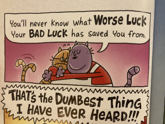 Just because you believe something doesn’t make it true. But big Jim believes it does. Nice touch for grandpa’s backstory to be in B&W. Cutie shooties sure are cute. First epic smackdown song! 3 face plants 😆 You’ll never know what worse luck your bad luck saved you from. Notes and fun facts always interesting but do the kids read & relate to them or are they for adult Dog Man fans?