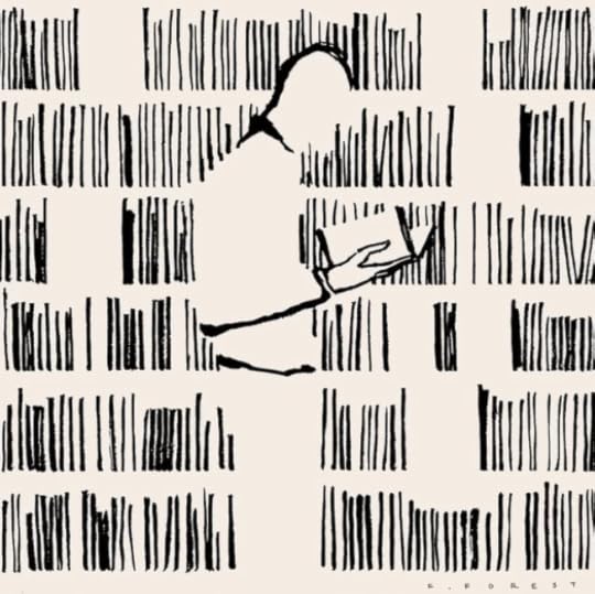 Image: Stylised line drawing of a figure opening a book, standing in front of a bookcase, by Frederic Forest (Source)