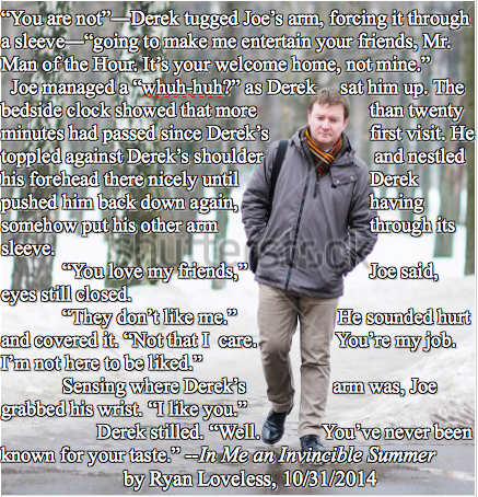I wasn't expecting this book to be so well done, but it really was. In Me an Invincible Summer was a incredibly polished, thoughtful story about a man coming to terms with his sexuality and himself for the first time in his life. If the main character, Joe, was younger, I'd call this a coming of age story. Instead, it is an intense, realistic journey of self-discovery.