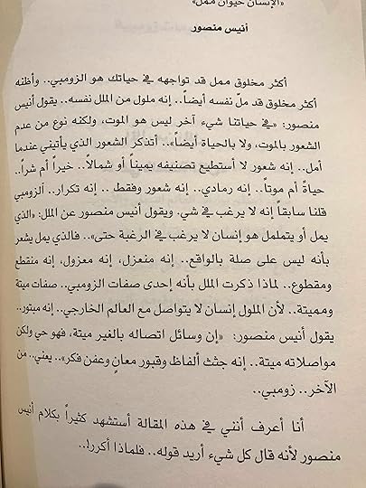 فهو تحدث في هذا الكتاب عن الصفات المشتركة بين هذا الإنسان الحي الميت وبين الزومبي الذي نراه في الأفلام، كنت أطيل القراءة ي بعض الصفحات فقط لأتخيل وأتفكر في تشبيهات الكاتب، فهي فعلا تحتاج إلى تأمل.