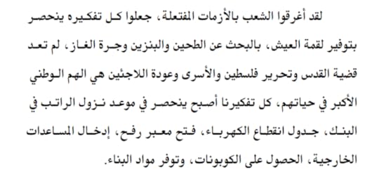 اعتبر نفسي محظوظ ��افتتاح السنه بهذه الرواية القصيره للكاتبه الفلسطينيه امتياز النحال زعرب الروايه عماره عن احداث يوميه لاسره فلسطينيه في غزة اثناء الحرب الظالمه الاسرائيلية والقصف الهمجي من جيش الاحتلال حاولت الكاتبه ان تضع جزء من كل السيناريوهات اليوميه في القصه قدر المستطاع لايصال الم ومعانات الشعب الفلسطيني الذي لم يكن له دور في اختيار ان يكون هذا نصيبه ولكن اجبر عليه حسب وصف الكاتبه الكتاب سلس ولغه سلسه ممتعه في البدايه وجدته كتاب عادي لقصه نعرفها كلنا وكان بين النجمتين والثلاث في تقييمي الا ان وصلت الي الثلث الاخير والذي اعتبره جوهر وابداع الكاتبه لما فيه من موضوعيه احسدها عليه قد لا تعجب كثير من الفلسطينين امتياز لامت صراع السلطه في غزه واوضحت ظروف انسانيه اخرجت لنا جيل مقاومه كان ممكن ان يوكد في اي مكان اخر لو كان الظروف مشابهه وهاذا ما وجدناه في حالات الربيع العربي