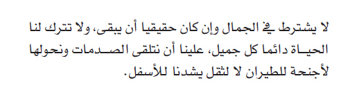 ولا تتوقف ان وجدت مطبا في حياتك , التفت لترى الطرق الاخرى , قد تمر عبر طريق فرعي ضيق مظلم لكن ستصل الى الطريق الصحيح , نتخذ الكثير من القرارات الخاطئه في حياتنا ’ وبدل ان نلتفت لاتخاذ قرار أصح , نستمر في دربنا الخاطىء وما تترتب على هذا الدرب من مآسي ونقضي ما تبقى من حياتنا بكل رتابه , هناك دائما فرصه ثانيه تنتظر منا اغتنامها .