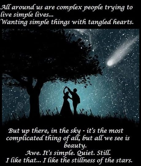 "All around us are complex people trying to live simple lives," she said. "Wanting simple things with tangled hearts." From the stars below to the stars above, one a field of color, the other blue and silvery-white. "But up there, in the sky - it's the most complicated thing of all, but all we see is beauty. Awe. It's simple. Quiet. Still."