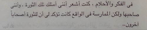 لا أعرف كلمة أكثر قدرة على إيقاظ نفس البشر من كلمة الثورة, إنها تعني القدرة على التغيير , والحماس , ووضح الهدف , وامتلاك الوسائل للفعل والحرية في الإقدام عليه .. ولكن سرعان ما تتحول الثورات إلى "أنظمة" و "أجهزرة" و "مصالح"