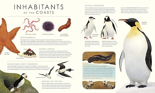 The illustrations are extremely colorful, but soft in their presentation. No hugely loud colors, just vibrant painted and drawn depictions of the animals and their environment. One of the most interesting was the two page spread on Coasts. So many different elements were depicted, and you got to learn about various aspects of the life that call that part of the ocean home.