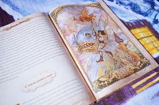 "Aeiou și Aquarela reușeau întotdeauna să se oprească primii din accesul de sughiț, așa că imediat după plecarea intempestivă a împăratului și a micii sale suite au ieșit în grădinile palatului, alergând printre straturile de flori și roiurile de fluturi, râzând și cântând sub soarele cald al Basmaniei. Au privit pe cer la peștele mare ce continua să dea din coadă și să arunce jeturi înalte de apă sărată, aproape într-un mod mecanic. Din mișcările la indigo pe care balena le făcea și din faptul că nimic din atitudinea ei nu dădea semne că ar avea o voință proprie, Aquarela a tras concluzia că nu ghicise cuvântul ascuns de Aeiou. S-a rugat de el să i-l spună, dar Aeiou, încăpățânat, n-a vrut în ruptul capului să-l destăinuie și a continuat să râdă întruna, încercând să ascundă tristețea ce-l cuprindea de fiecare dată când Aquarela nu deslușea ce ascundea el." (p.58-59)