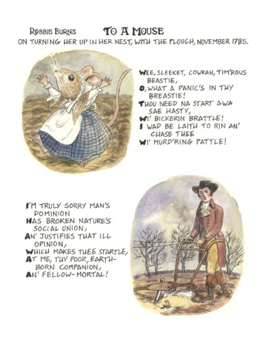 How often have I heard this quoted, misquoted, or at least referred to? It's such handy shorthand to say "Ah… the best laid plans…" when commiserating over an unexpected loss. This is from "To a Mouse, on Turning Her Up in Her Nest With the Plough, November, 1785". The artist has illustrated each of the eight stanzas with charming, old-fashioned drawings of the apologetic farmer and the rightly miffed Mrs Mouse, in an apron and bonnet. But he consoles himself by saying the mouse is lucky compared to him, because she knows only about the present and not the past or future.