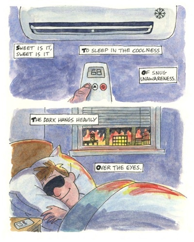 The seasons begin with "SUMMER", and I've chosen the poem "Truth" by Gwendolyn Brooks, the first African-American to win the Pulitzer Prize. Although the poem was written around 1949, and may refer to general fear of the unknown, and 'be careful what you wish for', the artist has chosen to use powerful cartoon art to show how we regard climate change. "Sweet is it, sweet is it To sleep in the coolness Of snug unawareness.