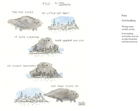 Moving from snow to fog. This is a handy one for those who would like to be able to quote but have trouble memorising. " The fog comes on little cat feet.