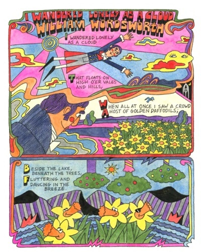 I was delighted by the bright, cheery cartoon illustrations of the mood evoked by William Wordsworth's "I Wandered Lonely as a Cloud." These were not the whimsical images I was expecting for Wordsworth, but they may be closer to how excited he was by what he was imagining. "When all at once I saw a crowd A host of golden daffodils."