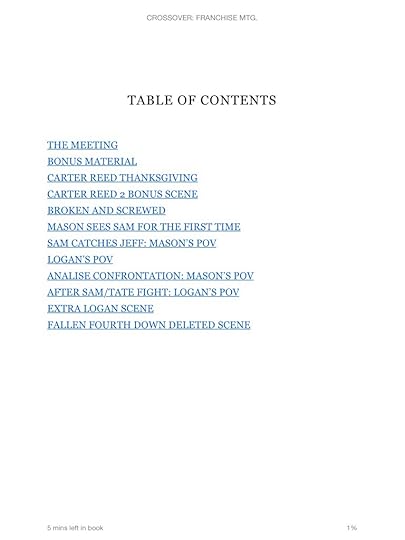 Anyway, it was Tijan having fun. All of the bad reviews? They must have not have read the description. It wasn't described as a story with an exciting plot and ending. I personally thought it was an interesting meeting of characters. The gathering has the Fallen Crest peeps giving their perspectives. Reading on in the book there is added scenes to Carter Reed and Fallen Crest books. My favorite was Mason's POV of the time they made Sam's crazy mom drink liquor and then took her to a hotel.