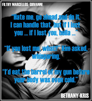 Book two of the Filthy Marcellos tackles the youngest brother of the crew and the woman whom catches his eye. Giovanni and Kim have a whirlwind romance I definitely enjoyed reading. The forbidden aspects of it played right into what I love about those types of romances and the passion here was just as great as in Antony and Lucian's stories. There were a few times in the story where I felt the actions of both Giovanni and Kim were a little far fetched however this never detracted from overall enjoyment of their story. There's something about Gio's reckless ways that didn't grab me like I was caught in Lucian's serious web yet the fun-loving brother caught in his own web spun by the fun-loving Kim kept me entertained throughout. Told from the 3rd person points of view like the others, Bethany-Kris easily draws you into her stories.