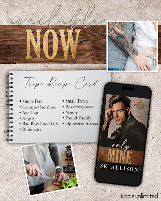 Title: Only Mine (Falcon Haven Series) Author: SK Allison Hero/Heroine: Saint & Wrenley What to Expect: Small Town, Single Dad, Widower, Age Gap, Influencer FMC, Chef MMC, Mental Health Representation, Grumpy x Sunshine,