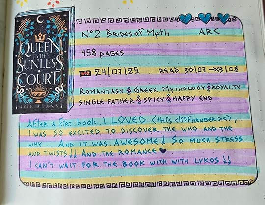 Queen to the Sunless Court is the second and final book in the Brides of Myth duology. Avie Adams delivered an epic and heartfelt conclusion to an amazing story where I couldn't turn the pages fast enough. The lyrical writing combined with Greek mythological elements and the romance made it such a wonderful read.
