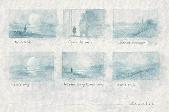 Compositional Thumbnail Sheet – Early thumbnail studies test the balance between lake, orb, pipe, and negative space, showing how the final image began by choosing restraint over spectacle.