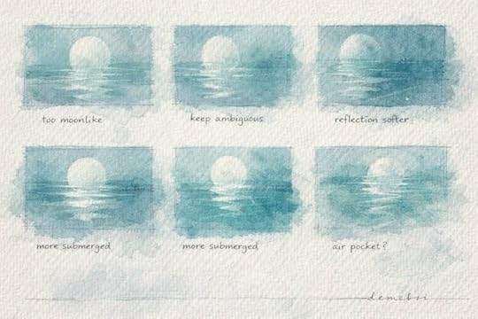 Light / Orb / Reflection Study – Studies of the central glow explore whether the orb reads as moon, bubble, lamp, breath, or memory, preserving the ambiguity that gives the final image its quiet unease.