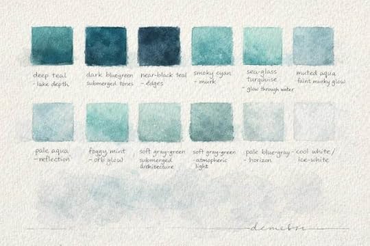 Color Swatch Sheet – Cover-derived washes of deep teal, smoky cyan, pale aqua, foggy mint, and near-black green establish the cold emotional weather of the finished watercolor.