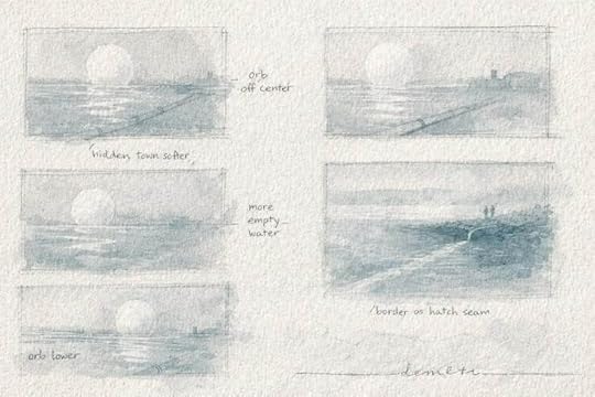 Pencil-Plus-First-Wash Stage – The first thin washes begin turning structure into mood, letting the lake, hidden architecture, and air-pocket glow emerge through pigment rather than detail.