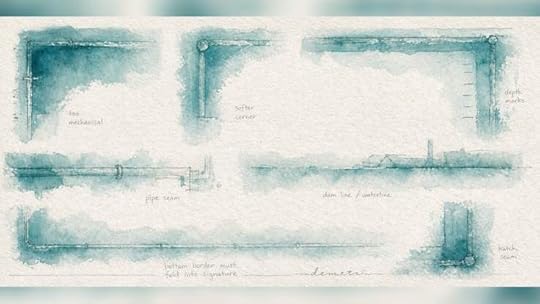 Watercolor Border Study – Border tests translate pipes, hatch seams, depth marks, and waterlines into a hand-painted frame that suggests containment without becoming decorative.