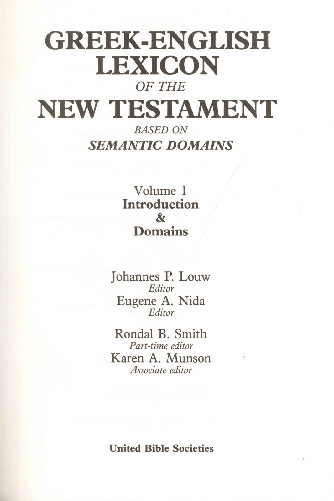 Two-volume lexicon. Volume 1 contains Introduction and Domains with Greek terms arranged and discussed according to 93 semantic domains. Volume 2 contains three Greek, English, and biblical references.