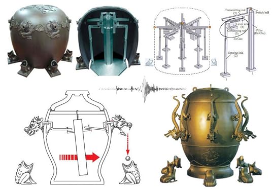 Some excerpts. P91 Re China, which has been prone to earthquakes for much of recorded history … “The first recorded earthquake occurred there in 1831 BC, and after a quake in 1177 BC, the Chinese began to keep regular records of quakes. An extraordinary Chinese scientist astronomer named Zhang Heng developed the first seismograph in the year 132. When a tremor hit, a ball fell from the mouth of a bronze dragon into the mouth of one of a series of bronze frogs below to indicate the direction of the earthquakes or origin.” Cool dat!