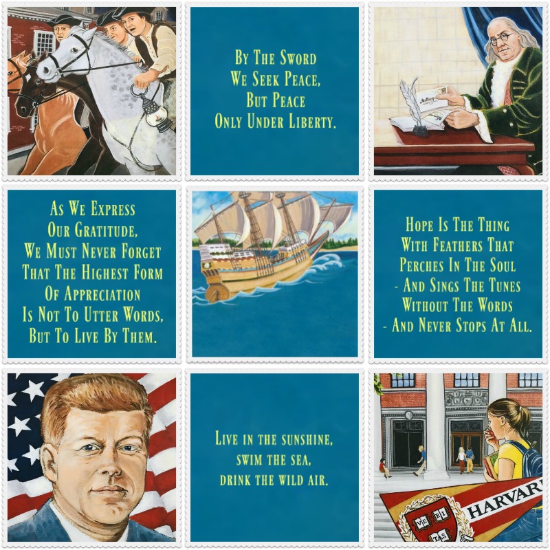 TRAVELED TO // Massachusetts - Boston - Springfield - Bunker Hill - Boston's Public Garden - Mohawk Trail - Faneuil Hall - Gloucester - Harvard - Martha's Vineyard - Cape Cod - Nantucket - Boston's Women's Heritage Trail - JFK Museum - JFK Library - Lexington & Concord - Plymouth - Stockbridge -Old North Church - Quabbin Reservoir - Salem - House Of The Seven Gables - Bridge Of Flowers - Webster Lake - Pigeon Cove - Old Sturbridge Village - Walden Pond - Sudbury 01776 - Beantown - MET ALONG THE WAY // Algonquin - Julia Ward Howe - JFK - Norman Rockwell - William Dawes - Paul Revere - Dr. Samuel Prescott - Robert Newman - Emily Dickenson - Nathanial Hawthorn - Boston Symphony Orchestra - Henry David Thoreau - Ralph Waldo Emerson - Benjamin Franklin -